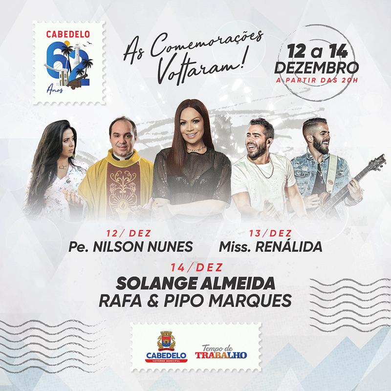 No dia 12 de dezembro, Cabedelo comemora 62 anos de emancipação política. Para marcar a data, a Prefeitura Municipal preparou uma programação festiva de três dias para a população. As atrações principais serão a cantora Solange Almeida e a dupla Rafa e Pipo Marques, que se apresentam ao público cabedelense no dia 14, na Praça Getúlio Vargas.