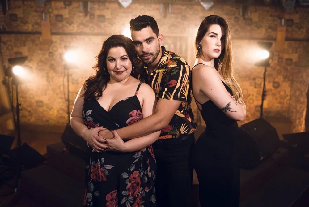 Gabriel Diniz, cantor de ‘Jenifer’, com as atrizes do clipe. À esquerda, Mariana Xavier, encarna a Jenifer. A ex-namorada ciumenta é a ex-BBB Aline Gotschalg — Foto: Divulgação Gabriel Diniz, cantor de ‘Jenifer’, com as atrizes do clipe. À esquerda, Mariana Xavier, encarna a Jenifer.