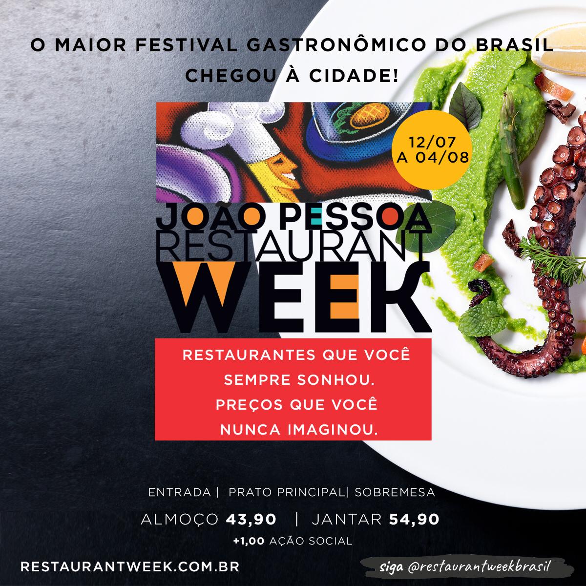 João Pessoa está inserida no calendário do Brasil Restaurant Week, considerado um dos maiores festivais gastronômicos do mundo e que tem conquistado um público cada vez maior a cada edição. O festival será realizado de 12 de julho a 4 de agosto e contará com os principais restaurantes da capital paraibana, com menus especiais e preços bastante competitivos. O almoço é oferecido a R$ 43,90 e o jantar R$ 54,90, mais R$ 1 para ação social.