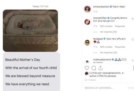 Nas redes sociais, Kim divulgou a primeira foto do bebê, com uma mensagem que recebeu do marido que dizia ” Lindo dia das mães com a chegada do nosso quarto filho. Somos abençoados além da medida. Temos tudo que precisamos”. Foi na legenda da foto que ela escreveu o nome do filho: Psalm West.