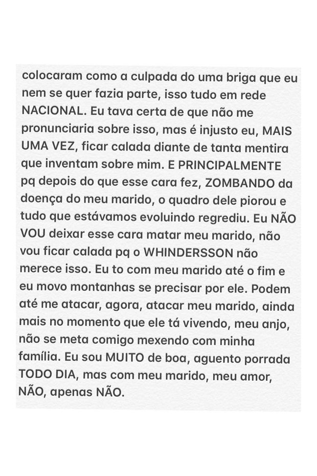 “Eu estava certa que não me pronunciaria sobre isso, mas é injusto eu, mais uma vez, ficar calada diante de tanta mentira que inventaram sobre mim. E PRINCIPALMENTE porque depois do que esse cara fez, ZOMBANDO da doença do meu marido, o quadro dele piorou e tudo o que estávamos evoluindo regrediu. Eu não vou deixar esse cara matar o meu marido”, diz um trecho.