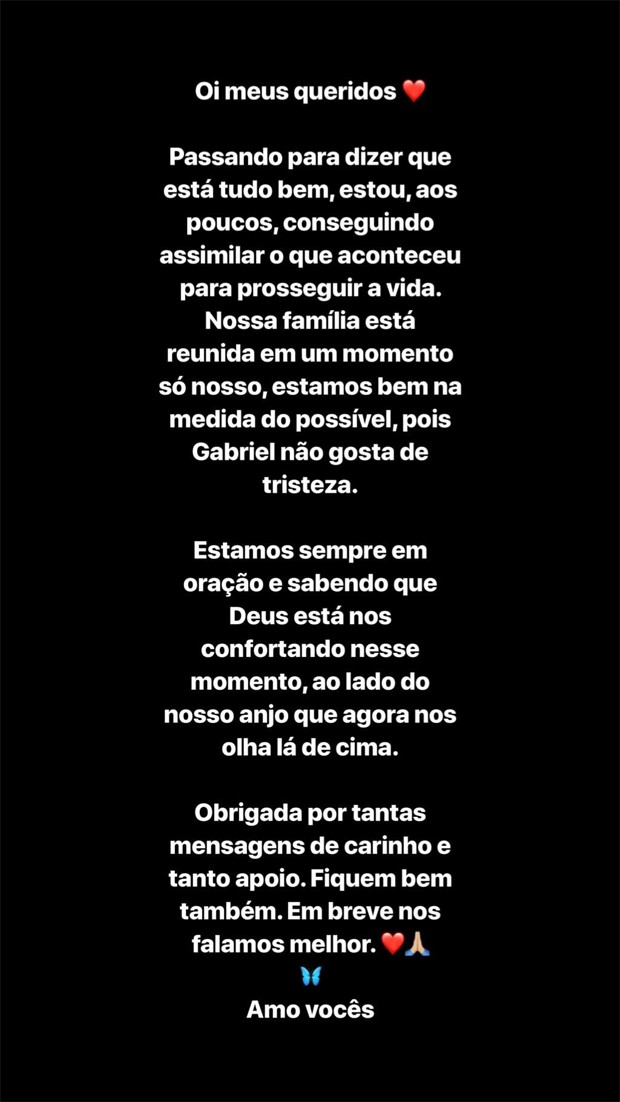 “Passando para dizer que está tudo bem, estou, aos poucos, conseguindo assimilar o que aconteceu para prosseguir a vida. Nossa família está reunida em um momento só nosso, estamos bem na medida do possível, pois Gabriel não gosta de tristeza”, começou ela.