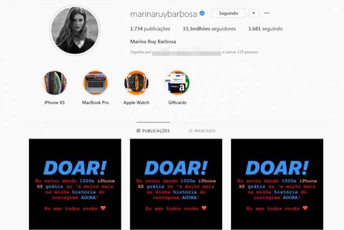 A atriz Marina Ruy Barbosa foi vítima de hackers na madrugada desta terça-feira. Com 33,3 milhões seguidores no Instagram, o perfil da atriz começou a divulgar uma suspeita doação de iPhones e outros produtos da marca Apple. A biografia da atriz no Instagram exibia um link para a tal promoção.