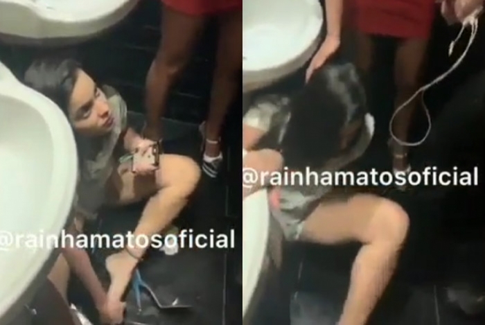 Em vídeos compartilhados pelo perfil “Rainha Matos” no Instagram, Mayla aparece sentada no chão do banheiro molhado, tentando arrumar as sandálias e ao fundo o gerente do local e seguranças se esforçam para colocar ordem na confusão.