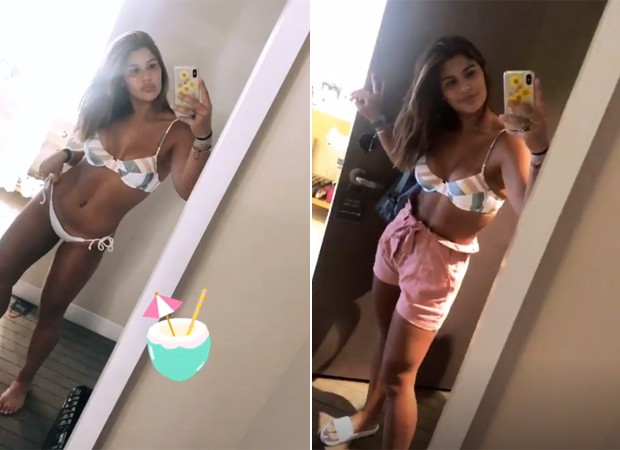 Giulia Costa está curtindo dias ensolarados e quentes em sua viagem com a família aos Estados Unidos. Na manhã desta segunda-feira (22), a atriz compartilhou clique e vídeo em que aparece de biquíni, pronta para renovar o bronze.