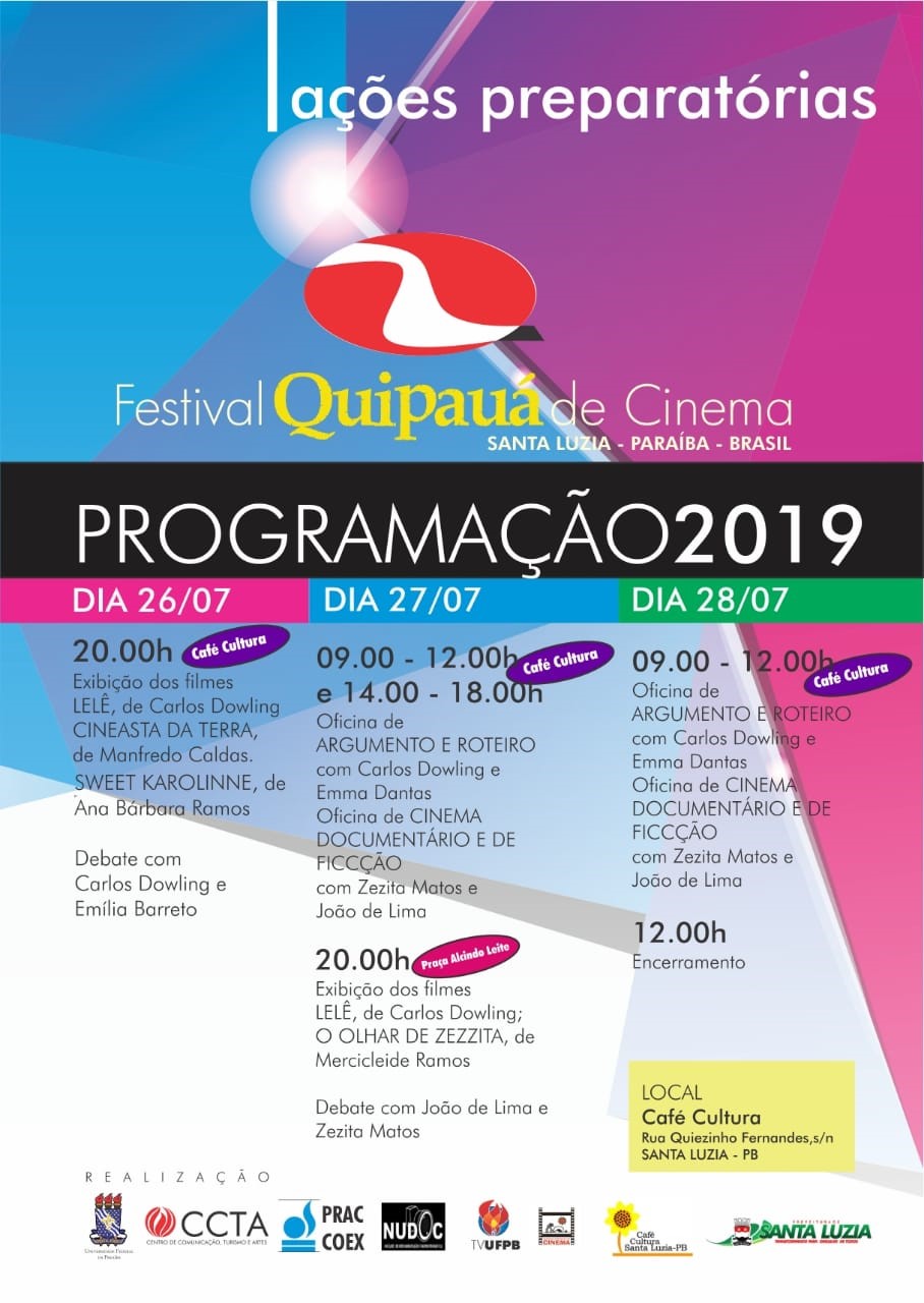 O município de Santa Luzia sediará a segunda etapa do Festival Quipauá de Cinema, entre esta sexta-feira (26) e o próximo domingo (28), com vasta programação composta por exibição de filmes e oficinas com os temas “Argumento e Roteiro” e “Iniciação ao Cinema de Ficção e Documentário”.