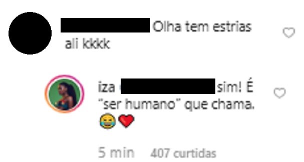 Nos comentários, uma fã reparou em um detalhe. “Olha, tem estrias ali! Kkk”, escreveu a seguidora. Sem pensar duas vezes, Iza respondeu. “Sim, é ser humano que fala”, afirmou a estrela, sendo apoiada por seus fãs.