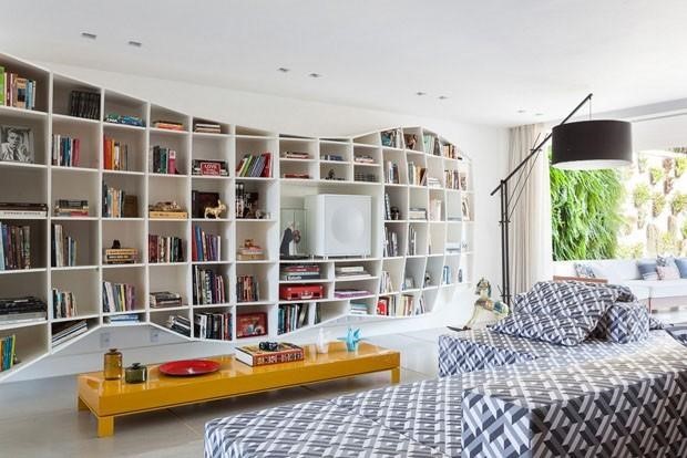 Se você gosta desta ideia, mas acha pesado investir em móveis planejados deste tamanho, a dica é apostar no seu talento! Desenhe como deseja este móvel e compre as madeiras já do tamanho desejado. Pode dar um pouco de trabalho, mas investindo em uma boa parafusadeira e com o material certo você conseguirá montar sua própria estante divertida!