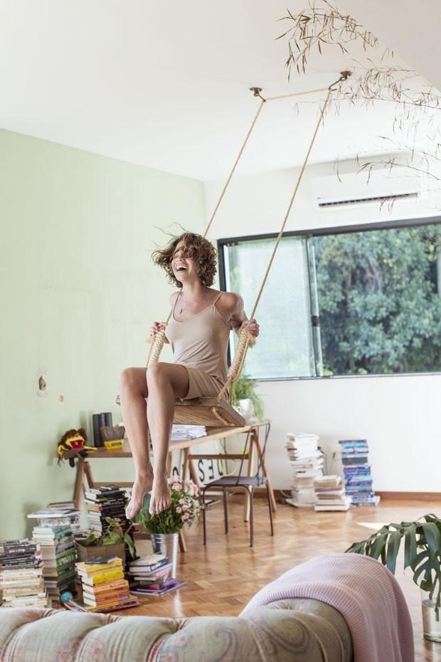 A jovem atriz Bruna Linzmeyer decidiu mostrar sua alegria na decoração da sala. Seu novo apartamento na Zona Sul do Rio de Janeiro é despretensioso e cheio de elementos naturais. As peças da decoração foram trazidas por ela em casa viagem que realizou. A sala de estar integrada com a cozinha e o escritório reflete essa mistura de histórias.