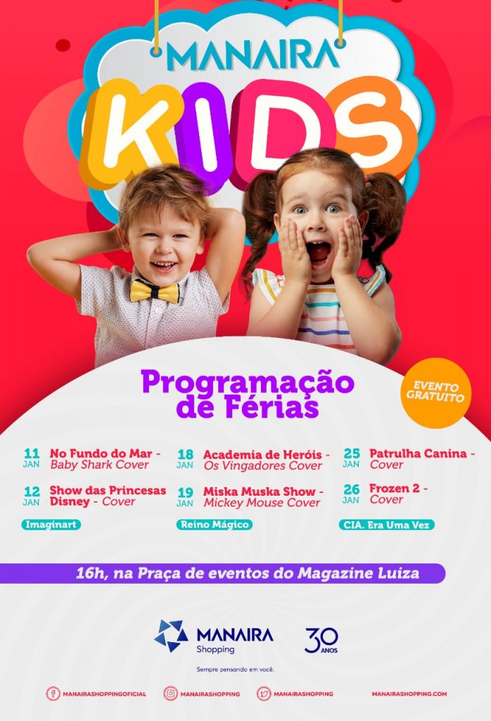Para animar ainda mais as férias da criançada, o Manaira Shopping preparou uma programação especial e gratuita para o público infantil. Nos sábados e domingos deste mês de janeiro, o centro de compras vai garantir a diversão dos pequenos com covers de heróis e princesas, e shows musicais inspirados em Baby Shark, Miska Muska Show – Mickey Mouse, Frozen 2 e Patrulha Canina. As apresentações vão ser Praça de Eventos do Magazine Luiza às 16h.