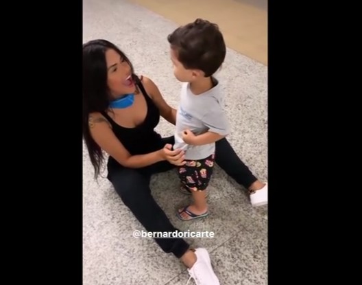 Bernardo foi receber a mãe no aeroporto de Natal, no Rio Grande do Norte. Eles se abraçaram e se jogaram no chão em um reencontro emocionante.