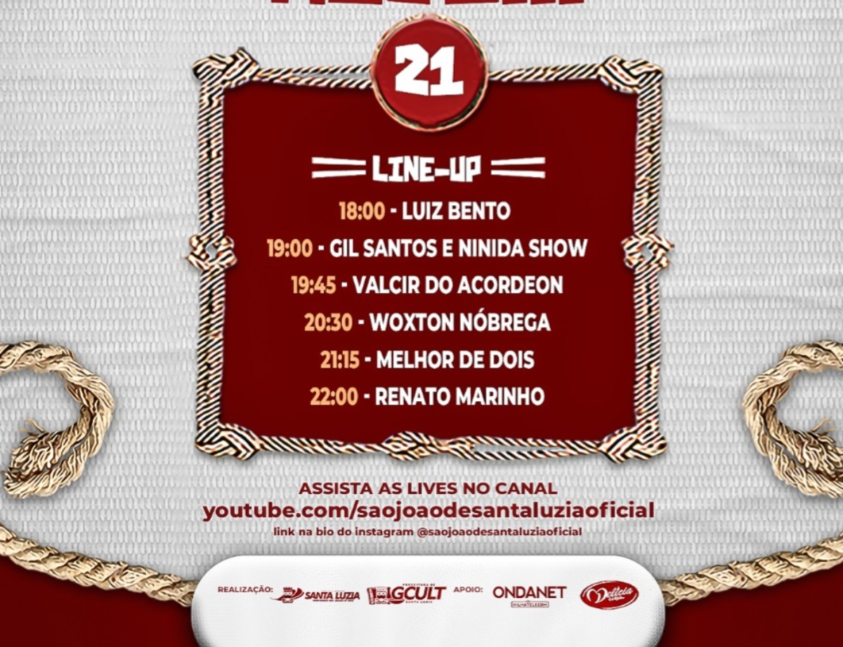 Neste primeiro dia, a partir das 18h, se apresentam o cantor Luiz Bento, seguido por Gil Santos e Ninida Show, Valcir do Acordeon, Woxton Nóbrega, Melhor de Dois e Renato Marinho. As apresentações poderão ser assistidas pela plataforma Youtube, no canal oficial do São João de Santa Luzia, com acesso pelo endereço: www.youtube.com/saojoaodesantaluziaoficial.