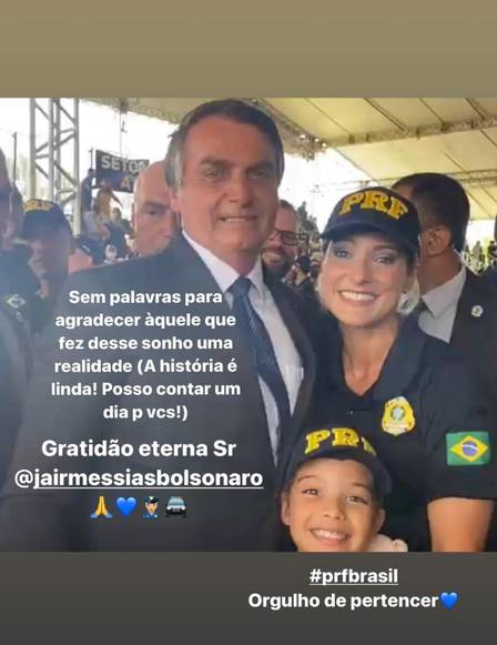 Silmara compartilhou registros no Instagram ao lado de uma viatura da PRF e usando o uniforme da corporação Na legenda da imagem, ela escreveu a frase “Quando os sonhos se realizam”, em inglês. Em outro post, ela aparece com o Bolsonaro na formatura.