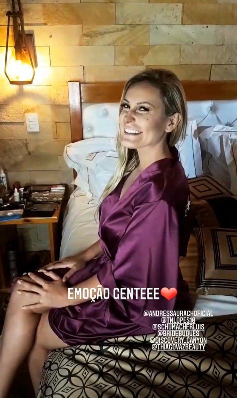 Andressa mostrou alguns detalhes da cerimônia e dos noivos caindo na piscina depois de deixarem o altar. Pela noite, a modelo também mostrou como foi a note de núpcias.