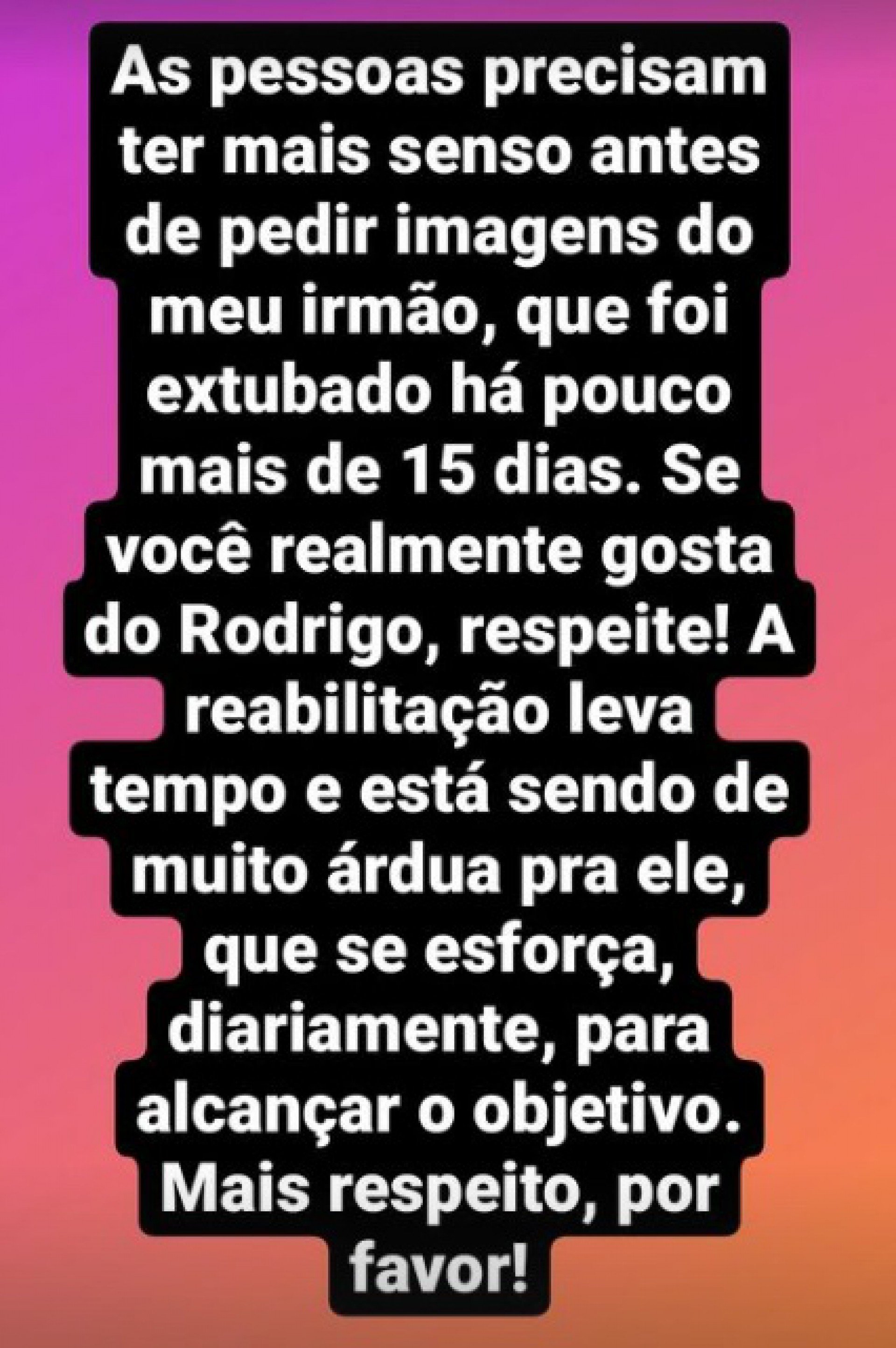“As pessoas precisam ter mais senso antes de pedir imagens do meu irmão, que foi extubado há pouco mais de 15 dias. Se você realmente gosta do Rodrigo, respeite”, pediu Diogo, que reforçou que o gerente comercial tem se dedicado em sua recuperação. “A reabilitação leva tempo e está sendo muito árdua para ele, que se esforça, diariamente, para alcançar o objetivo. Mais respeito, por favor!”, completou.
