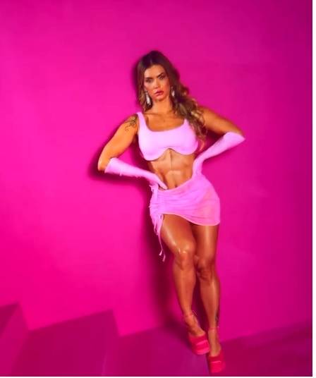Ela optou por um look todo rosa: usou um top e luvas, além de uma saia com amarrações na lateral e uma sandália de salto alto. O ensaio foi realizado nesta quinta-feira.