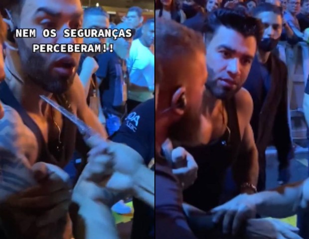 No momento em que a pessoa pega o acessório de Gusttavo, ele fica chocado e arregala os olhos, mas seus seguranças não percebem. Em seguida, ele pede calma para os fãs e continua andando. “Calma, calma! Que isso?”, disse ele.