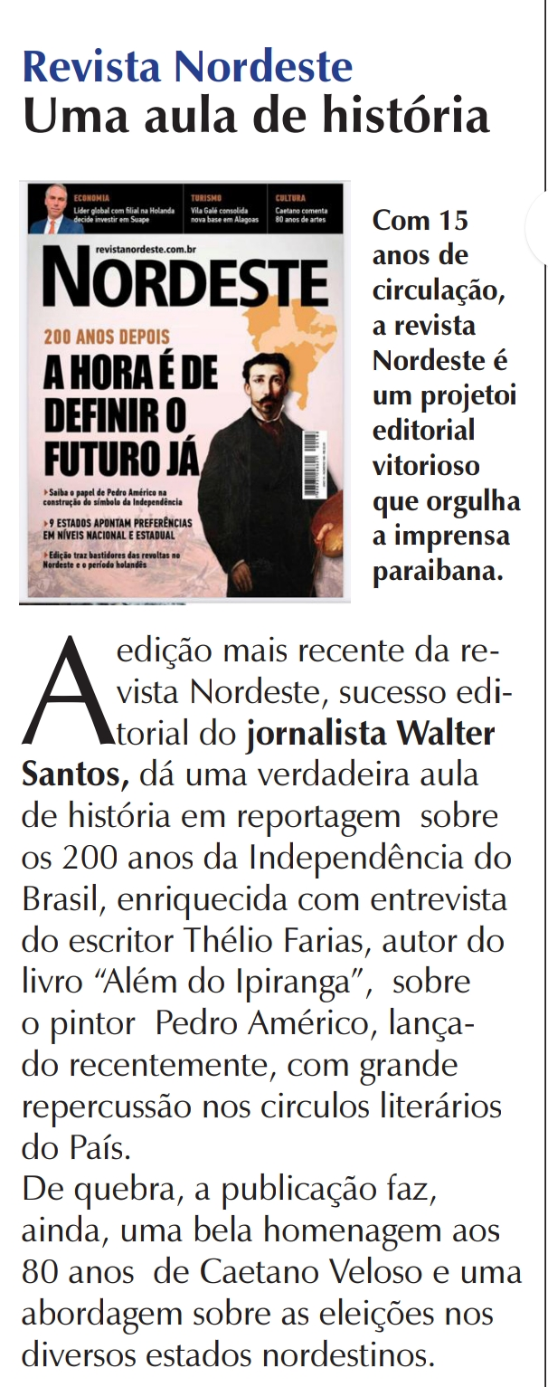 Na edição com versão também digital, a Revista NORDESTE traz entrevista exclusiva com o escritor e advogado Thelio Farias abordando seu livro “Além do Ipiranga – A extraordinária vida de Pedro Américo e suas incríveis facetas” ainda merecendo critica da professora doutora Madalena Zácara e ainda da também professora pós doutora Ariane Sá sobre a fase da Independência.