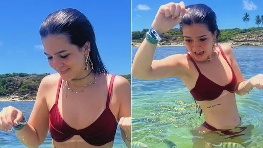 Mel Maia passou por uma situação inusitada em sua viagem para Porto de Galinhas, em Pernambuco. A atriz, de 18 anos de idade, contou para seus seguidores do Instagram neste domingo (25) que foi mordida por um peixe durante um banho de mar em uma praia paradisíaca. “O peixinho mordeu minha coxa”, contou na legenda.