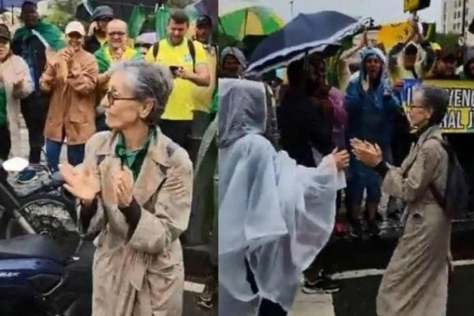 Usando um casaco longo por cima de uma blusa verde, Cássia Kis aparece em vídeos compartilhados nas redes sociais aplaudindo bolsonaristas na avenida Presidente Vargas, uma das principais vias da capital.