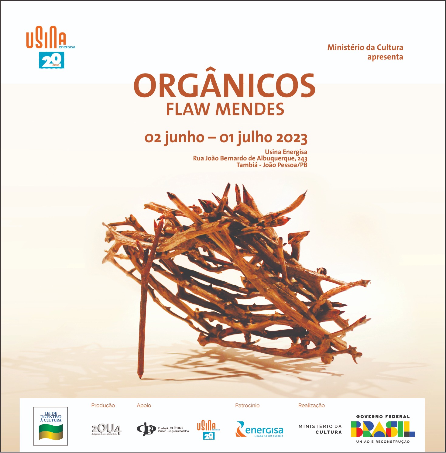 Com realização do Ministério da Cultura (Lei Rouanet), patrocínio do Grupo Energisa e apoio cultural da Usina Energisa e Fundação Cultural Ormeo Junqueira Botelho, o evento que tem entrada gratuita, pode ser visitado até 01 de julho, sempre de terça a sábado, das 13h às 18h.