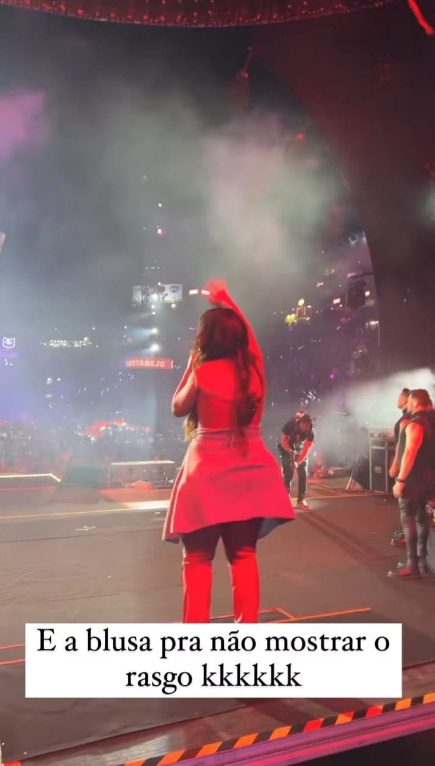Ela ainda brincou com sua produção ao perceber o imprevisto. “Sabe o que é? Homem não sabe vestir a gente”, disse ela, que minutos depois foi socorrida por membros da equipe com novas peças para cobrir o rasgo na calça.