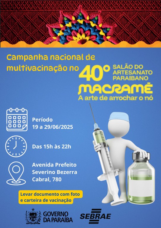 Uma série de serviços tem facilitado o dia a dia de quem visita o 40° Salão do Artesanato Paraibano, que está sendo realizado até o dia 29 de junho, das 15h às 22h, em Campina Grande. Com o tema “São João com forró, artesanato e vacina”, o mais recente serviço busca ampliar a cobertura vacinal — com a oferta de vacina contra febre amarela, tríplice viral, difteria e tétano (dT), hepatite B, influenza, ACWY (que protege contra quatro tipos de meningite bacteriana) e covid.