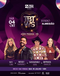 No próximo dia 04 de outubro, João Pessoa será palco de um dos maiores eventos musicais do ano. O Estádio Almeidão vai receber a partir das 19h um line-up de peso com WESLEY SAFADÃO, NATANZINHO LIMA, TATY GIRL e RAPHAELA SANTOS, reunindo o melhor do forró e da música nordestina em um só lugar.