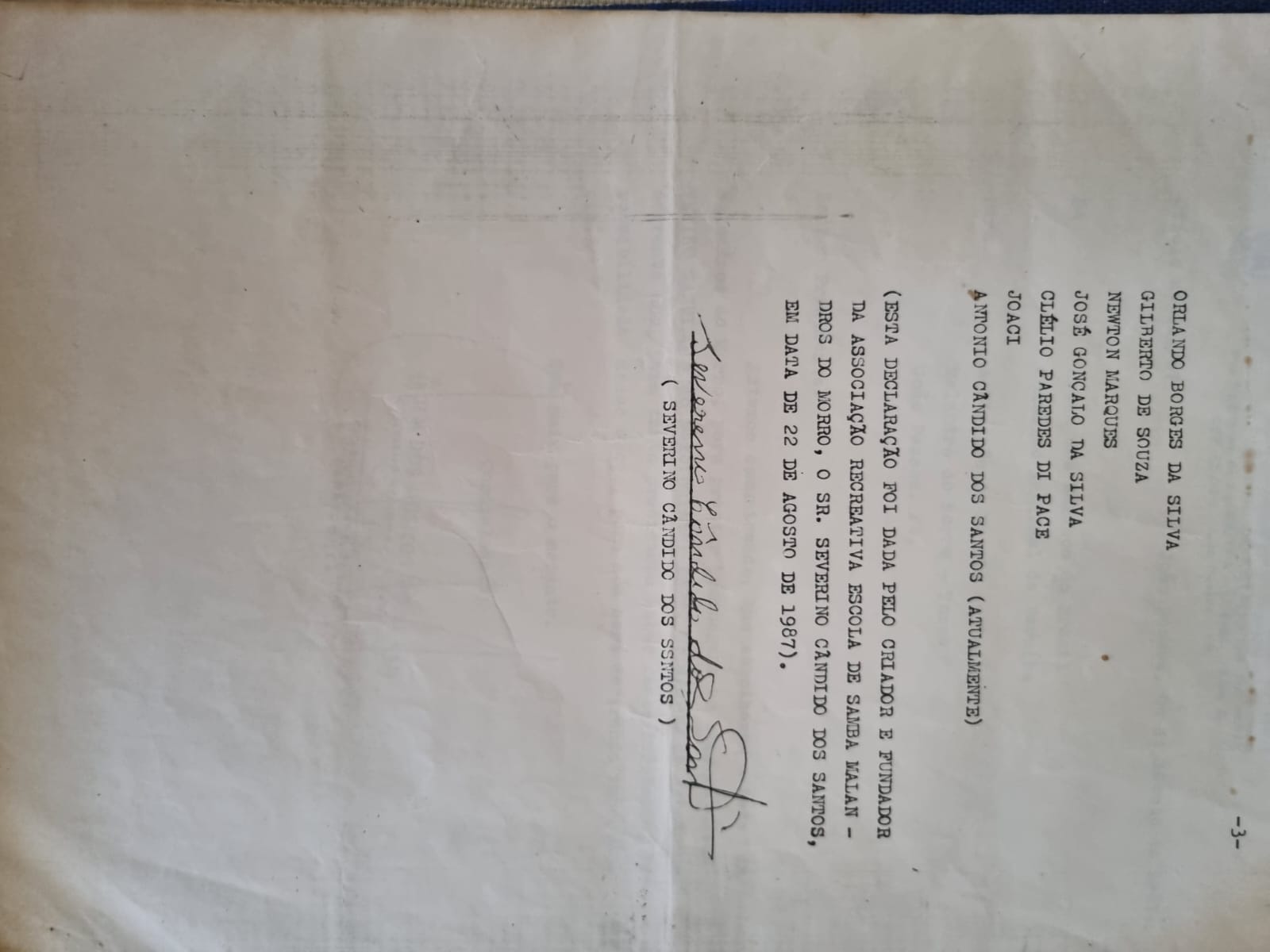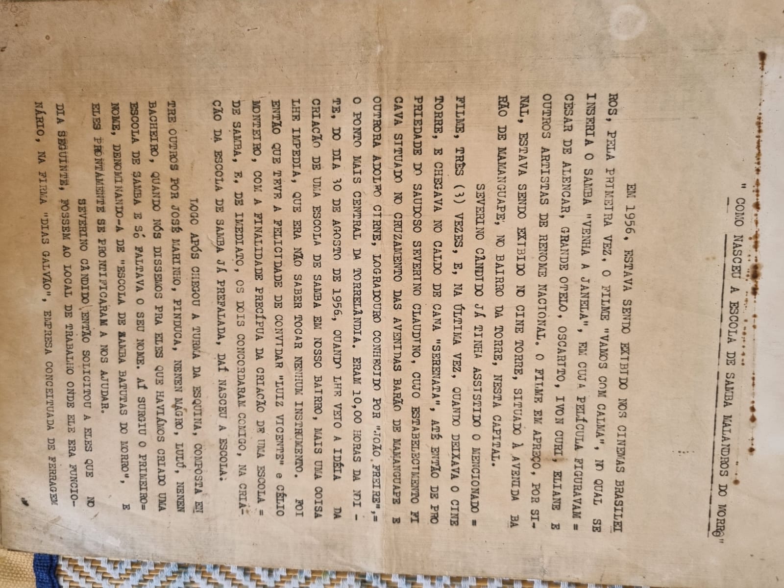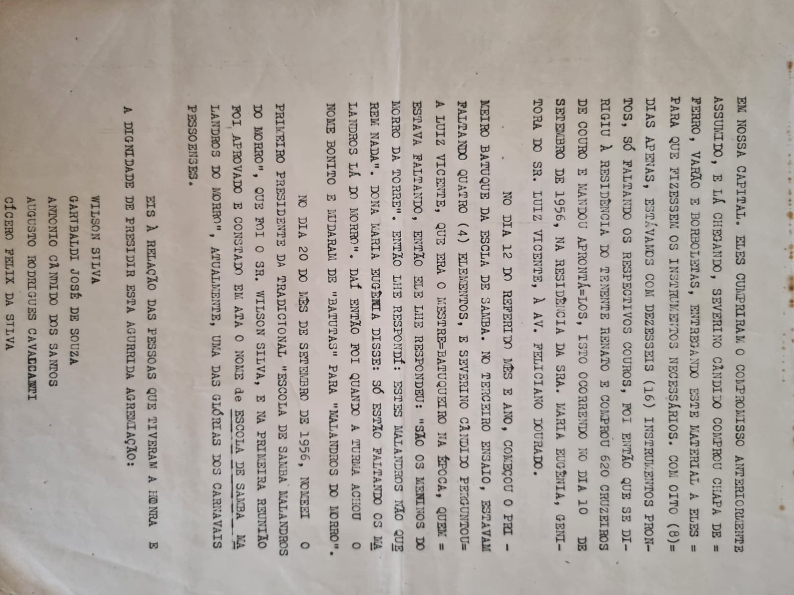 Com riqueza de detalhes ele cita que chamou alguns outros carnavalescos da época no bairro da Torre para se envolver na fundação sugerindo, como aconteceu, a presença deles na empresa à qual trabalhava para receber o material de criação dos primeiros instrumentos da Escola.