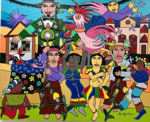 As características da arte de Clóvis Júnior são bem definidas pelos seus traços, pelas cores fortes e vibrantes e o conjunto das composições. “A minha inspiração vem das tradições, das festas e da religiosidade que eu trouxe da minha terra Guarabira, mas também retrato o meu ambiente, o que me toca, coisas relacionadas a minha região. Há elementos que estão presentes na maioria das minhas obras, como os cajus — que são memórias do bairro onde moro há mais de 30 anos, o Bessa”, conta.