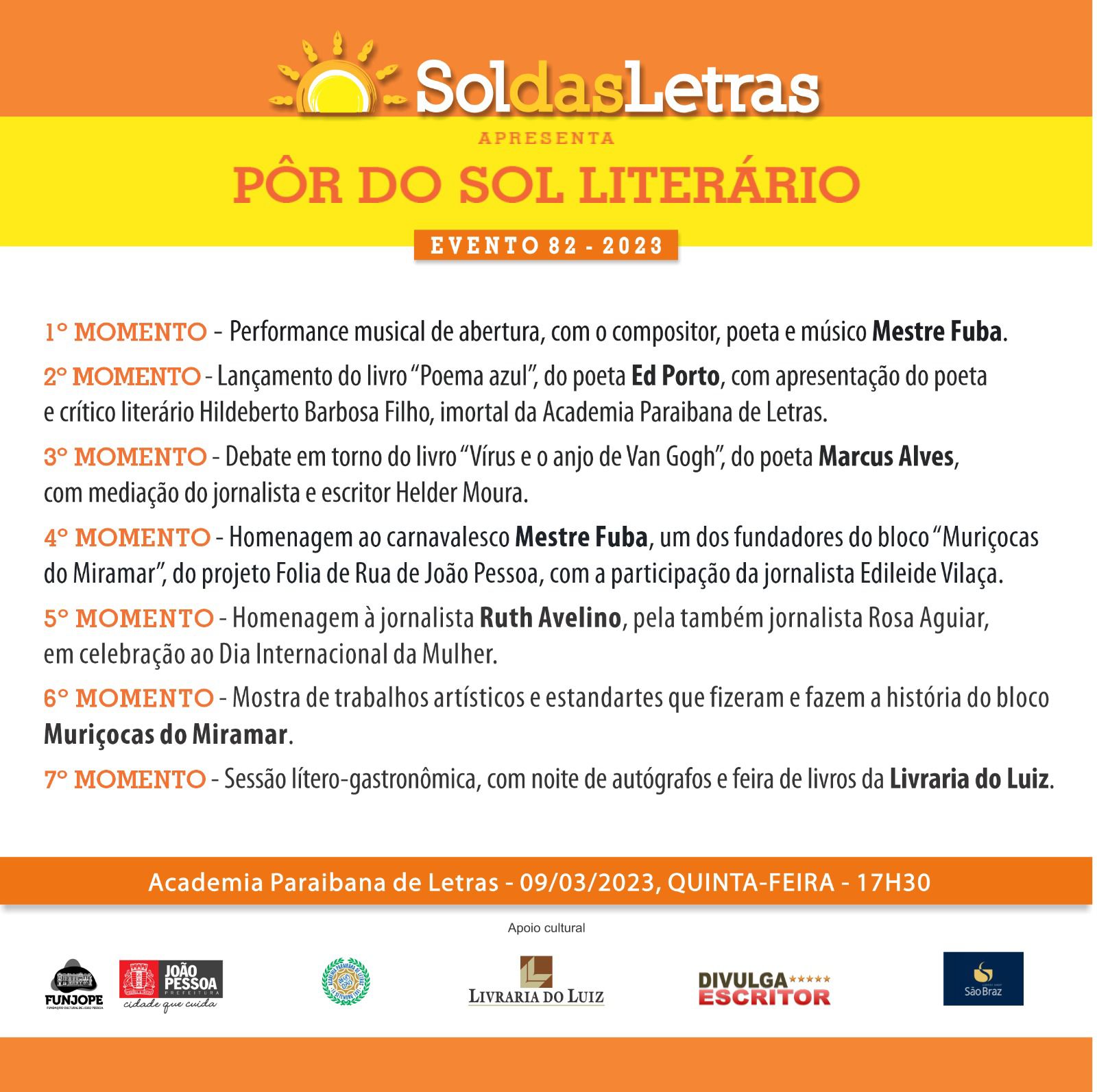 Programação – Além do debate sobre o livro ‘Vírus e o Anjo de Van Gogh’, a programação inclui uma performance musical de abertura, com o compositor, poeta e músico Mestre Fuba, que vai receber homenagem como um dos fundadores do bloco Muriçocas do Miramar; lançamento do livro ‘Poema azul’, do poeta Ed Porto, com apresentação do poeta e crítico literário Hildeberto Barbosa Filho, imortal da Academia Paraibana de Letras.