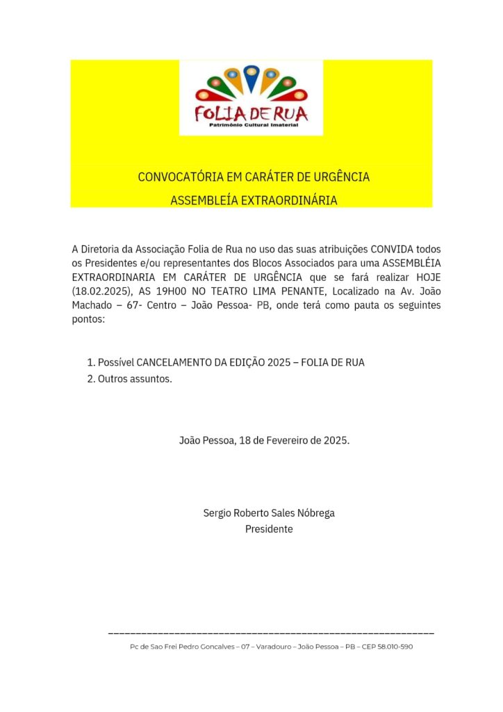 Diretores da Associação Folia de Rua estão discutindo com os quarenta blocos filiados da maior prévia carnavalesca a possibilidade de cancelar a versão 2025 em face de problemas no repasse de recursos. Edital de Convocação de Urgência foi divulgado chamando Assembleia Geral com todos os blocos na noite desta terça-feira (18) no Teatro Lima Penante.