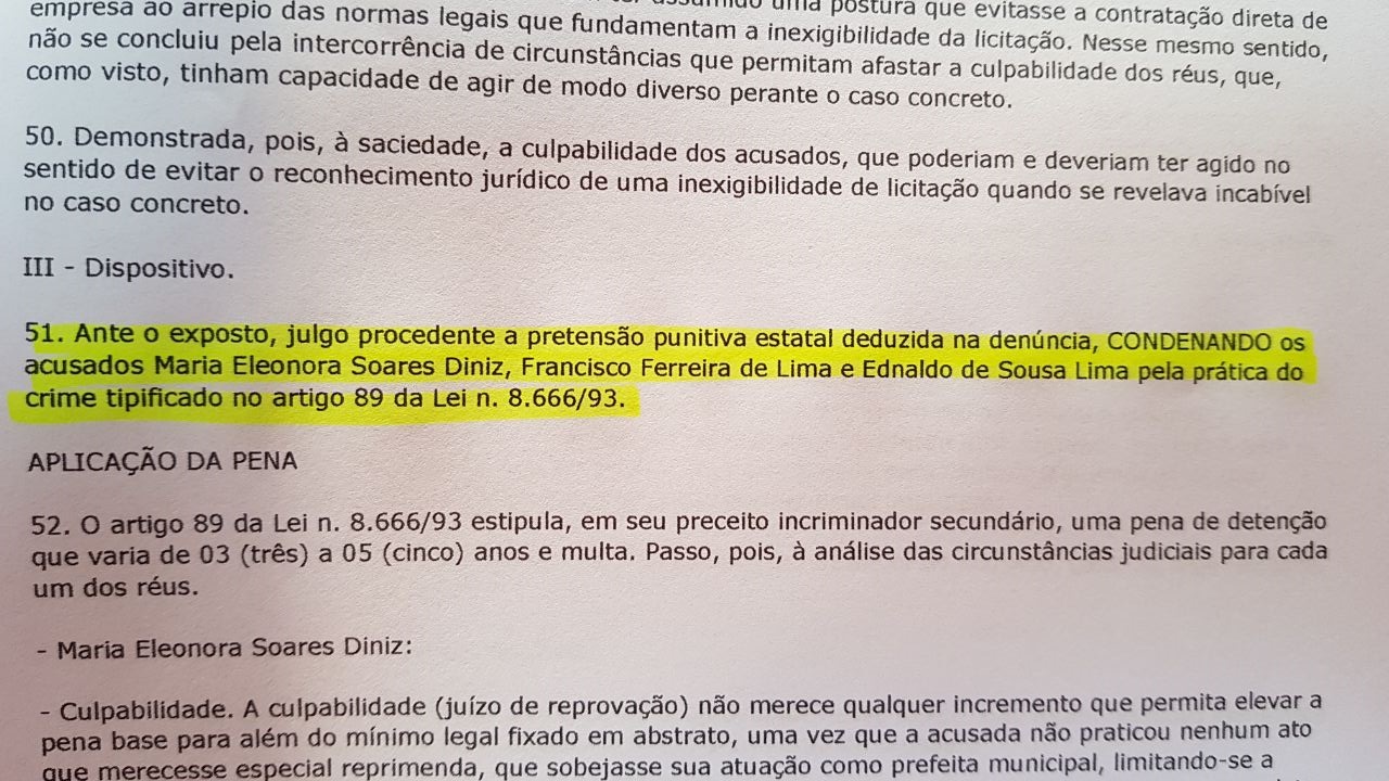 Segundo a sentença, o crime foi tipificado no artigo 89 da Lei n. 8.666/93 que estipula uma pena de detenção de três a cinco anos, além de multa.