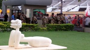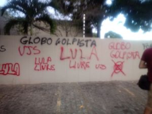 Com pichações e discursos contra Rede Globo, tratada como inimiga dos movimentos sociais, os manifestantes foram contidos por policiais que defenderam o prédio da emissora.