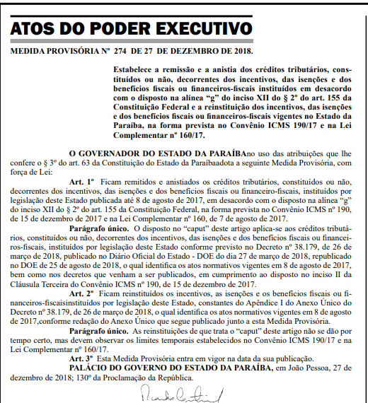 A medida também promove a reinstituição dos incentivos, das isenções e dos benefícios fiscais ou financeiros-fiscais vigentes no Estado da Paraíba, na forma prevista no Convênio ICMS 190/2017 e na Lei Complementar nº 160/2017, normas que, na prática, legalizam os incentivos fiscais concedidos pelo Estado a empresas sem aval do Conselho Nacional de Política Fazendária (Confaz).