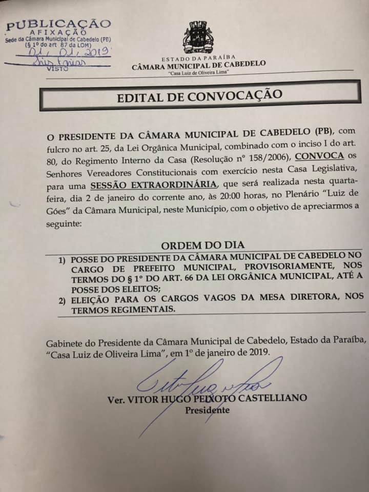 No edital de convocação, Vitor Hugo citou que o presidente do Poder Legislativo também deve assumir o comando do Poder Executivo na mesma sessão.