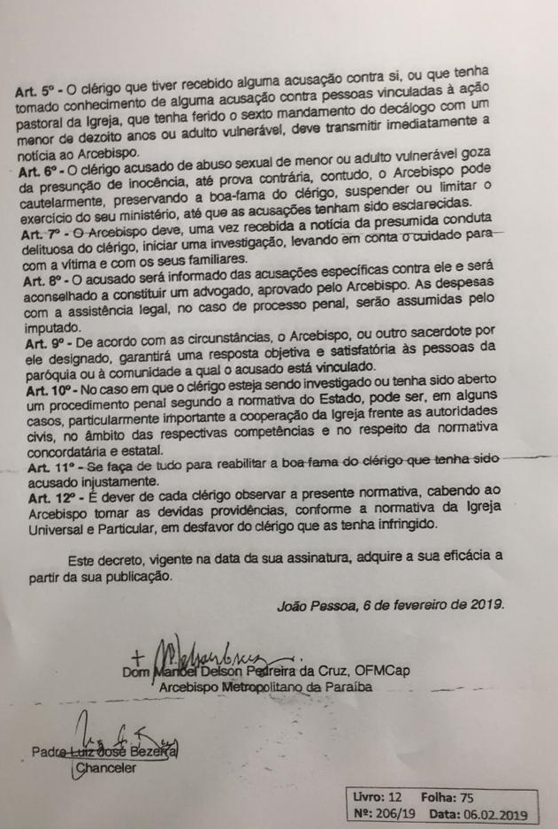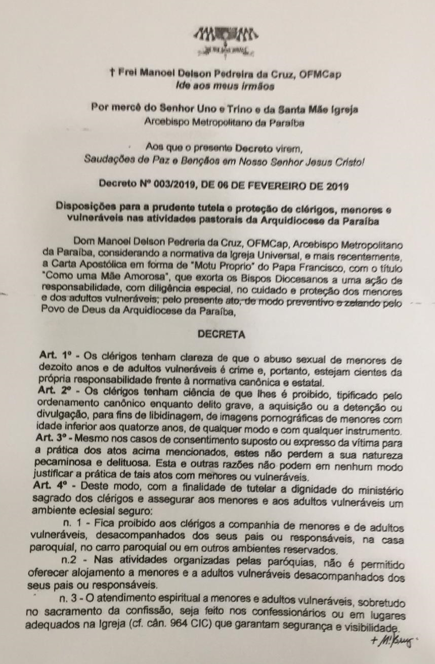 Um decreto assinado pelo arcebispo da Paraíba, Dom Manoel Delson Pereira, proíbe aos padres a “companhia de menores e de adultos vulneráveis, desacompanhados dos seus pais ou responsáveis, na Casa Paroquial, no carro paroquial ou em outros ambientes reservados”.