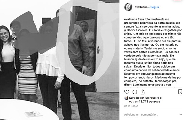 Em sua página no Instagram, Eva publicou uma sequência de fotos em que relata tudo o que passou desde os 12 anos, que vai de estupros e agressões físicas a formas de tortura: “As agressões eram verbais, físicas e psicológicas. Entre elas comer muito, em tempo estipulado. Isso aconteceu com uma pizza família, pra comer inteira em 10 minutos. Óbvio que não conseguimos. Também tomar 2 litros de refrigerante nesses 10 minutos… eu levei socos no rosto e ele não me deixava me proteger com a mão. Chutes até cair no chão”, escreveu ela.