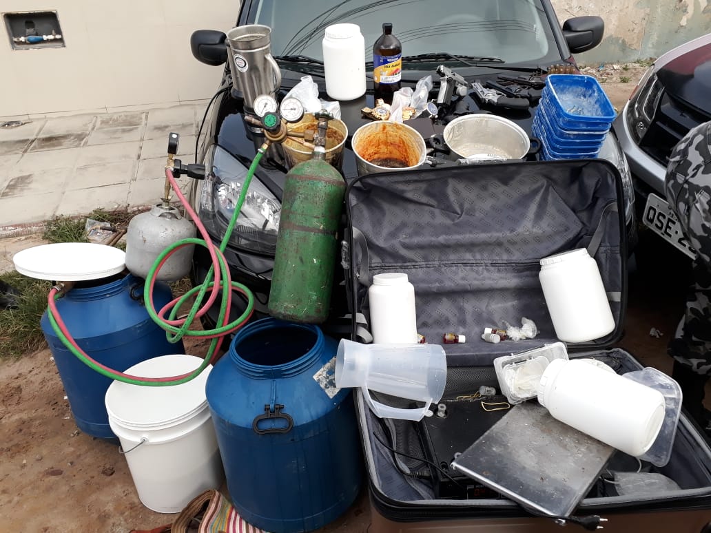 A Polícia Militar desarticulou um laboratório de cocaína que funcionava no Conjunto Novo Milênio, na Zona Sul da Capital. No local, que servia para o preparo de cocaína e seus derivados, foram apreendidos mais de 10 kg de drogas, quatro armas de fogo, munições, dois maçaricos, duas balanças de precisão, 1 litro de loló, quatro baldes com reagentes químicos usados na preparação de entorpecentes e liquidificadores para processar o produto. Um casal foi preso em flagrante pelas equipes da Força Tática e da 5ª Companhia do 5º Batalhão.