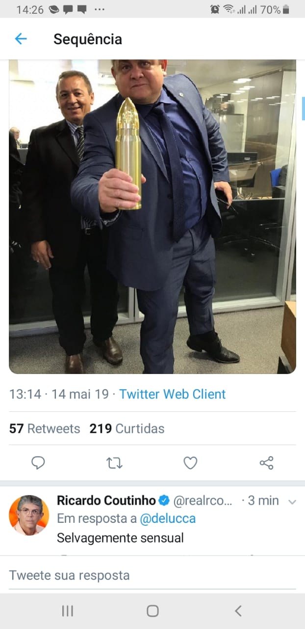 O ex-governador da Paraíba, Ricardo Coutinho (PSB), rebateu com bom-humor uma postagem do jornalista Willian de Lucca sobre a postura do deputado estadual Wallber Virgolino, na Assembleia Legislativa da Paraíba (ALPB). Virgolino afirmou que continuará a ir armado para a ALPB após ordem do presidente da Casa, Adriano Galdino (PSB), de colocar detectores de metais na entrada do prédio. Para demonstrar seu apreço pelas armas, o deputado posou segurando uma bala em tamanho aumentado.