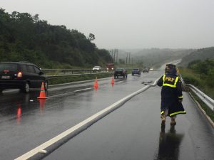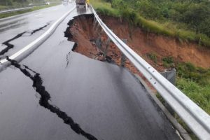 A Polícia Rodoviária Federal interditou uma mão da rodovia devido ao risco de desabamento. No local, agentes controlam o fluxo do trânsito para evitar acidentes.