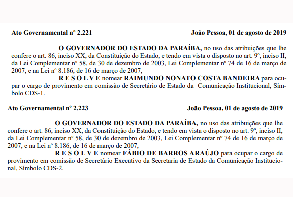 Conforme antecipado pelo Portal WSCOM, a edição desta sexta-feira (2) do Diário Oficial do Estado (DOE) apresentou as publicações das portarias de nomeação do jornalista Nonato Bandeira na função de Secretário de Estado da Comunicação Institucional, e do próximo secretário executivo da pasta, Fábio de Barros Araújo.