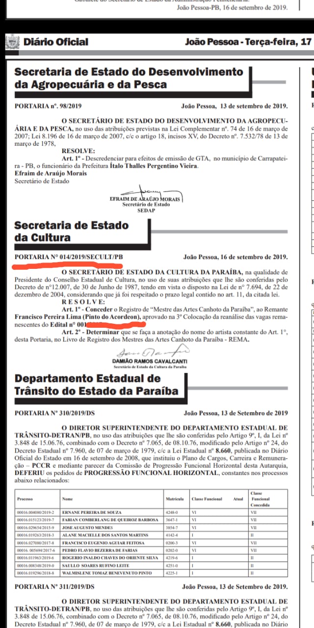 O Diário Oficial do Estado (DOE) trouxe, nesta terça-feira (17), em ato da Secretaria de Estado da Cultura (Secult), a publicação do título “Mestre das Artes Canhoto da Paraíba” ao artista paraibano Francisco Ferreira Lima, o Pinto do Acordeon.