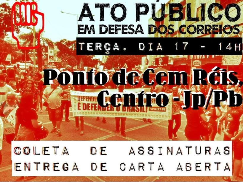 O movimento acontece às 14h, no Ponto de Cem Réis e tem como objetivo distribuir uma Carta Aberta, além da coleta de assinaturas contra a privatização dos Correios.
