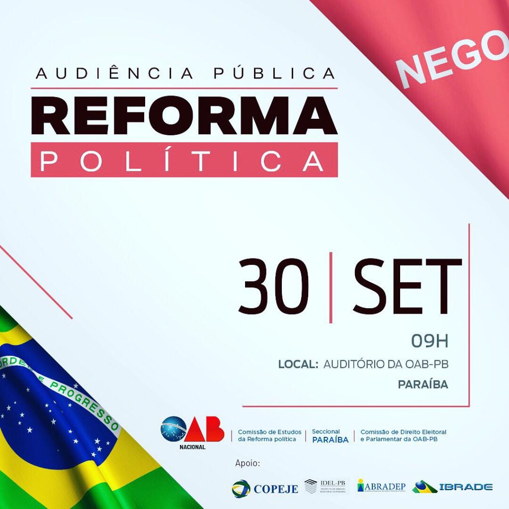 A Ordem dos Advogados do Brasil, Seccional Paraíba (OAB-PB), através da Comissão de Direito Eleitoral e Parlamentar, realizará, no próximo dia 30, audiência pública para debater a reforma política e mudanças no sistema eleitoral.