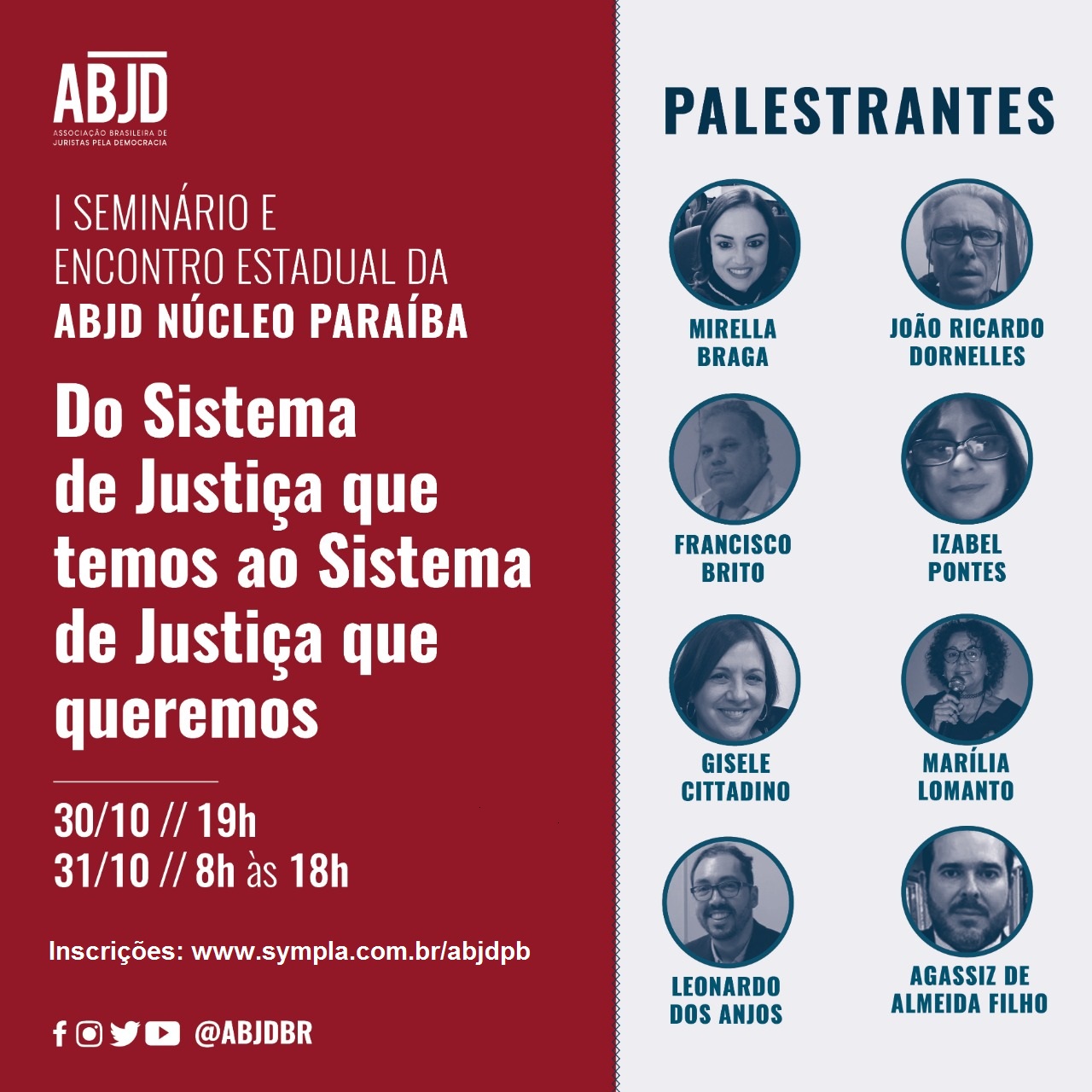 Nos dias 30 e 31 de outubro, a Associação Brasileira de Juristas pela Democracia – Núcleo Paraíba (ABJD-PB) realizará o 1º Seminário e Encontro Estadual da ABJD-PB, com o tema “Do Sistema de Justiça que temos ao Sistema de Justiça que queremos”. As inscrições podem ser feitas no site: www.sympla.com.br/abjdpb