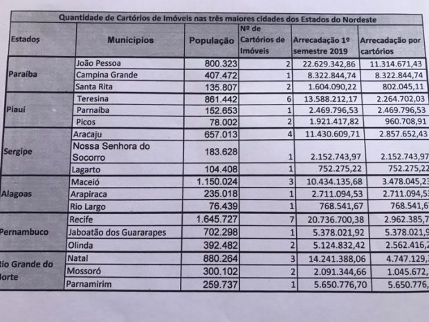 Veja tabela de faturamento dos maiores cartórios do Nordeste que aponta João Pessoa em primeiro lugar: