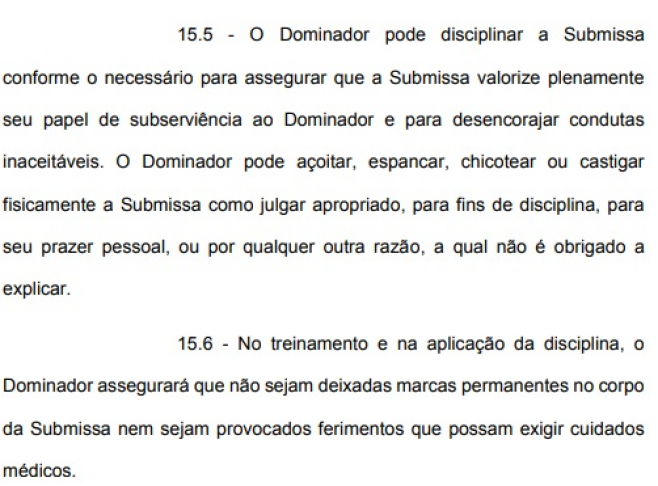 “O Dominador pode açoitar, espancar, chicotear ou castigar fisicamente a Submissa como julgar apropriado, para fins de disciplina, para seu prazer pessoal, ou por qualquer outra razão, a qual não é obrigado a explicar. No treinamento e na aplicação da disciplina, o Dominador assegurará que não sejam deixadas marcas permanentes no corpo da Submissa nem sejam provocados ferimentos que possam exigir cuidados médicos”.