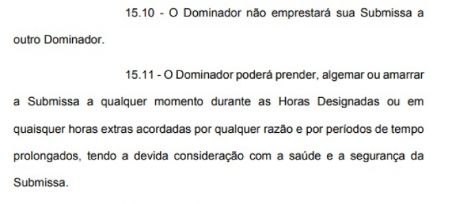 Além disso, o documento cita que o “Dominador” aceita a “Submissa” como propriedade sua, “para controlar, dominar e disciplinar”.