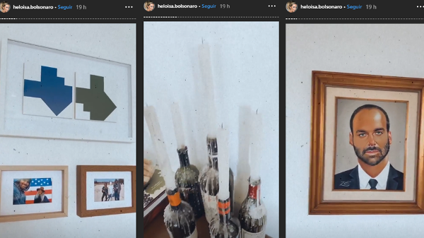 Na parede ao lado, o casal pendurou um pôster de Bolsonaro com a faixa presidencial, acima de uma placa onde se lê “Deputado federal Eduardo Bolsonaro”.